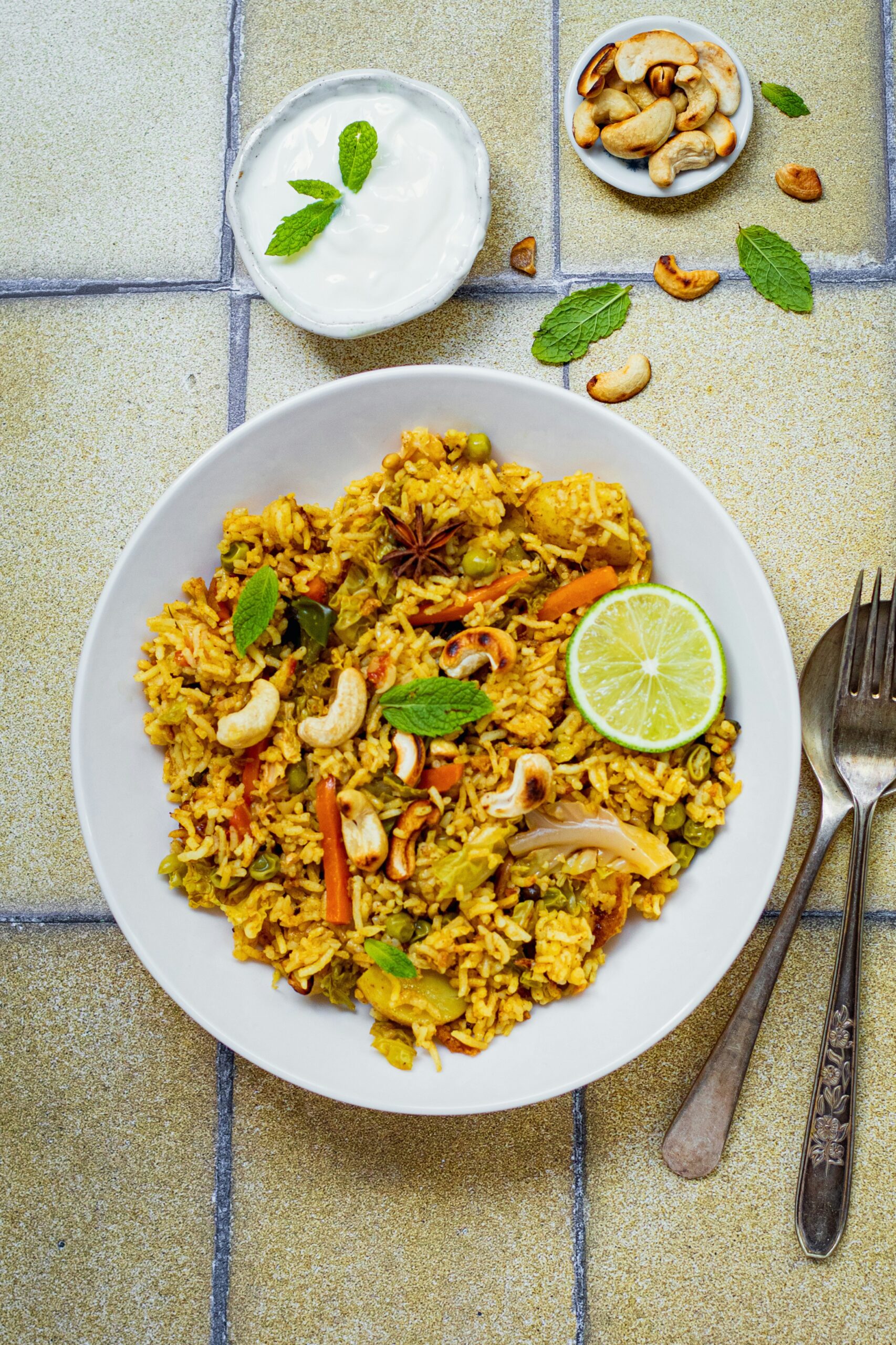 5 ) Remove the lid. Add Kewda essence. Mix well and garnish with fried cashew nuts and mint leaves. Serve hot with curd or raita.