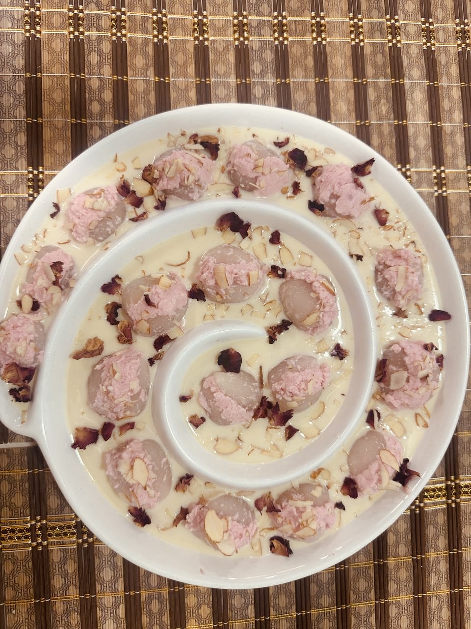 4) Pour the prepared milkmaid rabdi in the serving dish then arrange stuff lychee and garnish with edible rose petals