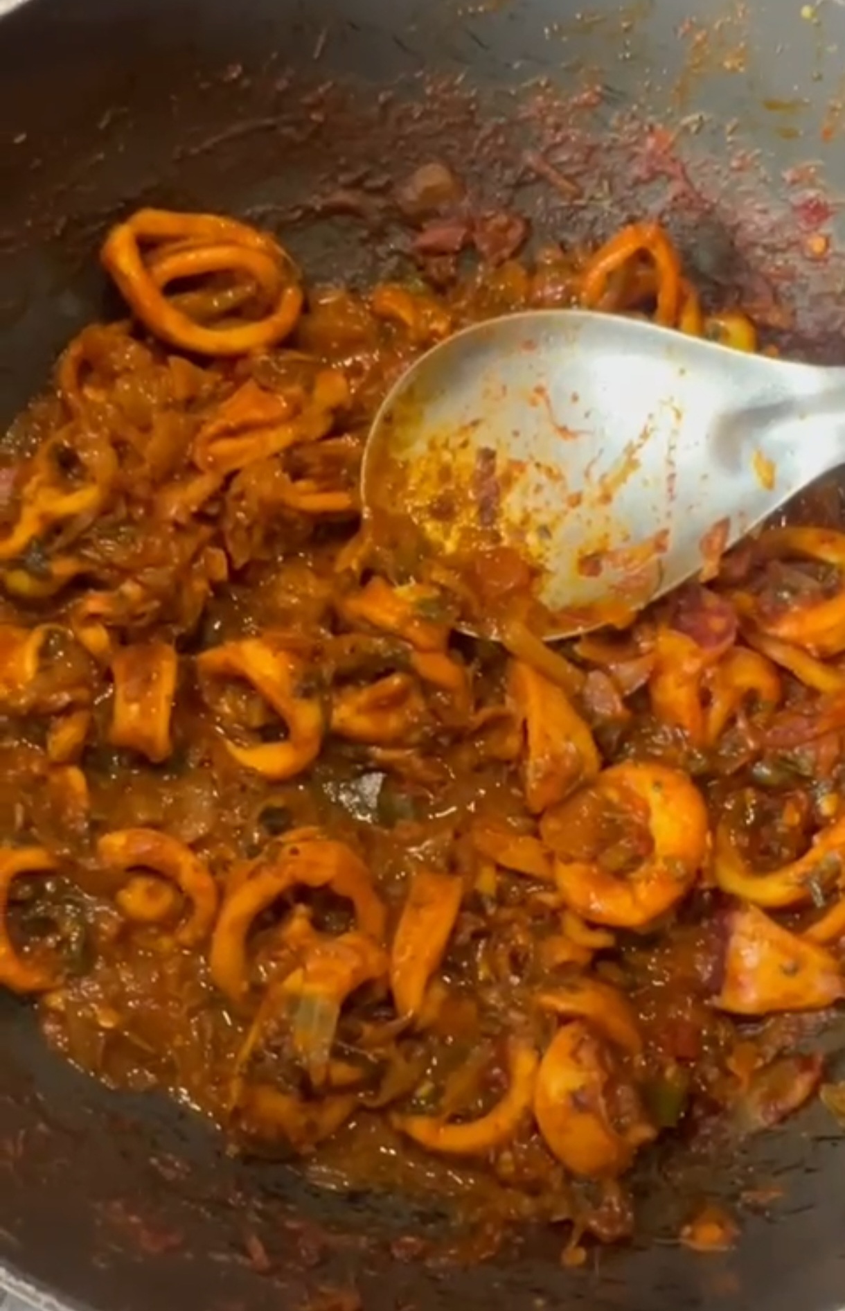 6 ) Add the squid. Add red chilli powder, remaining fish masala, chopped garlic, fish sauce and chilli flakes—season with salt. Mix well. Cover and cook for 10 minutes over a low flame. Keep sauteing in between. Once done, check for a thick consistency. Remove from flame and serve hot.